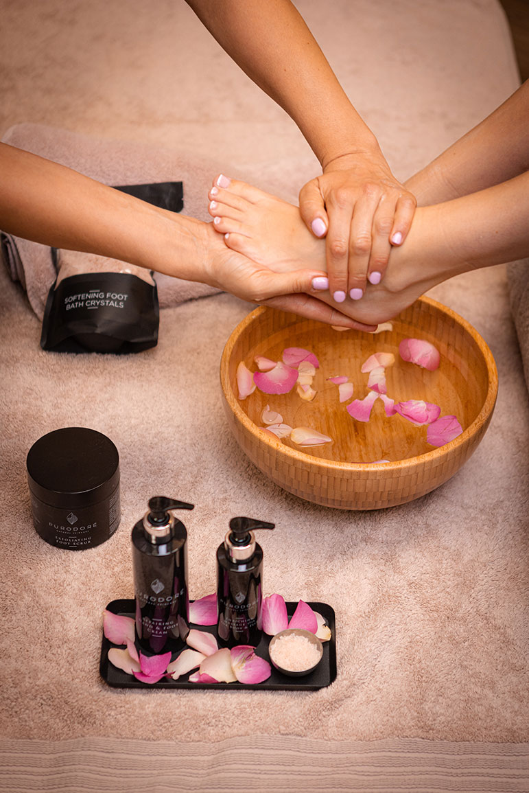 Purodoré jalkahoito on suunniteltu pehmentämään, ravitsemaan ja hemmottelemaan jalkoja kokonaisvaltaisesti. Hoito alkaa rentouttavalla ja ihoa pehmentävällä jalkakylvyllä, jonka jälkeen jalat kuoritaan hellävaraisesti sileiksi ja pehmeiksi. Kynsinauhat ja jalat saavat ravitsevaa hierontaa, joka vilkastuttaa verenkiertoa ja poistaa väsymyksen tunteen. Lopuksi iho hemmotellaan syväkosteuttavalla voiteella, joka tekee jaloista silkinpehmeät ja hyvinvoivat. Hoidon kesto on 90 min.